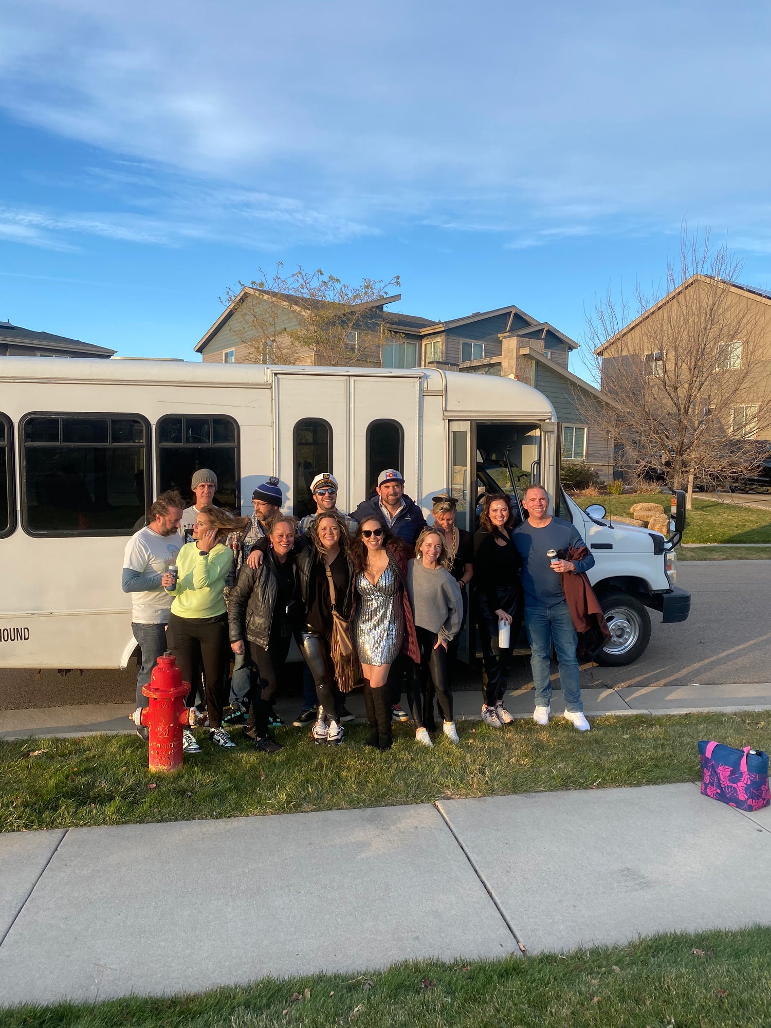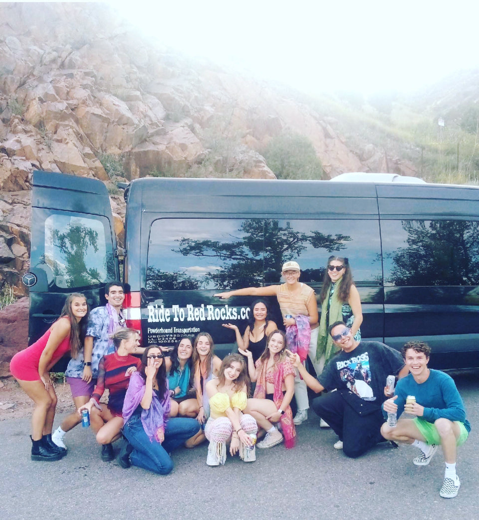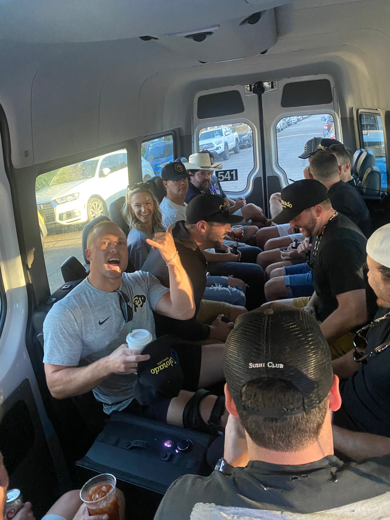 Powderhound services the home team or visitors alike! Our buses and Sprinters hold 14 or 28 passengers. Pictured is a group from the Denver Highlands, 2023, that got a roundtrip to Folsom Field.