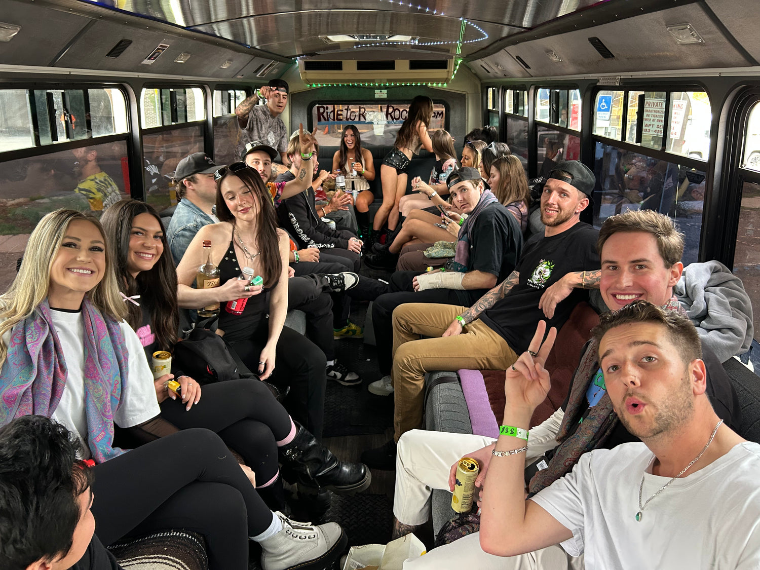 Call or text 888-248-7772 to check availability. Bus comes with subwoofer, cooler, water, and ice. Parks in the south lot, drops at the top.